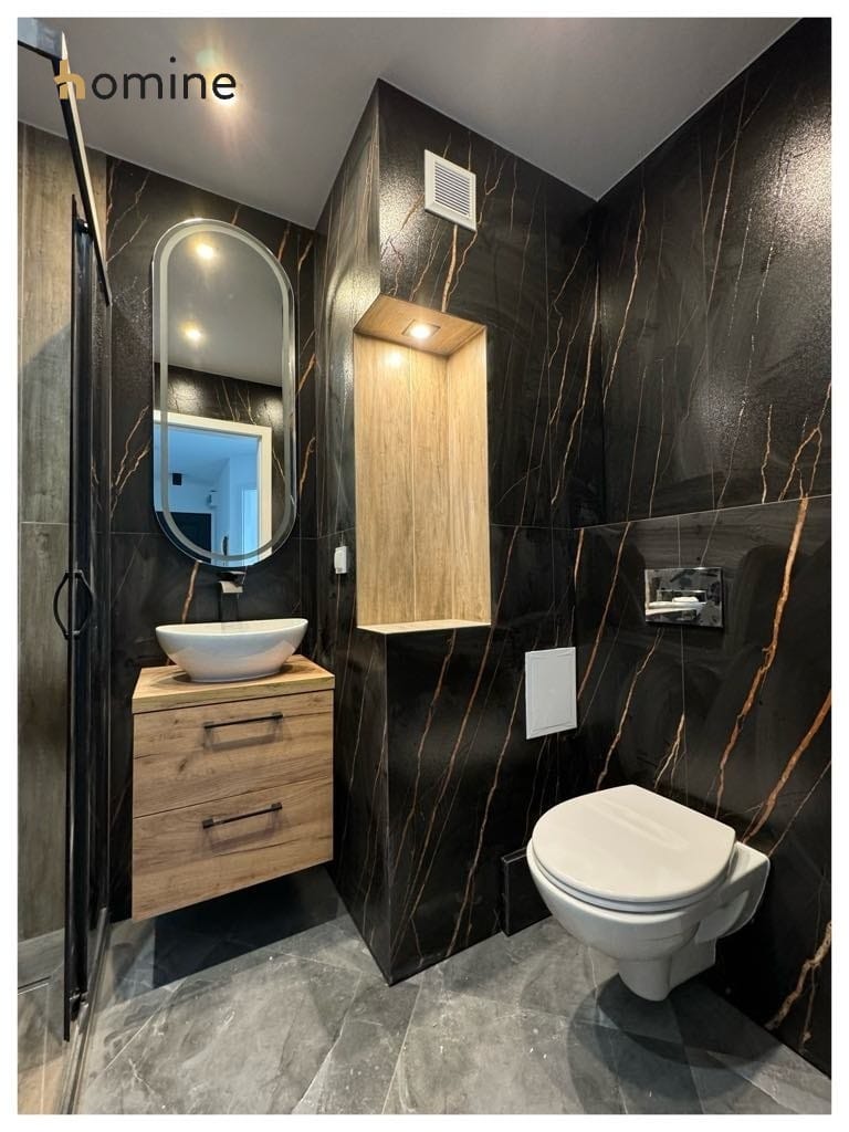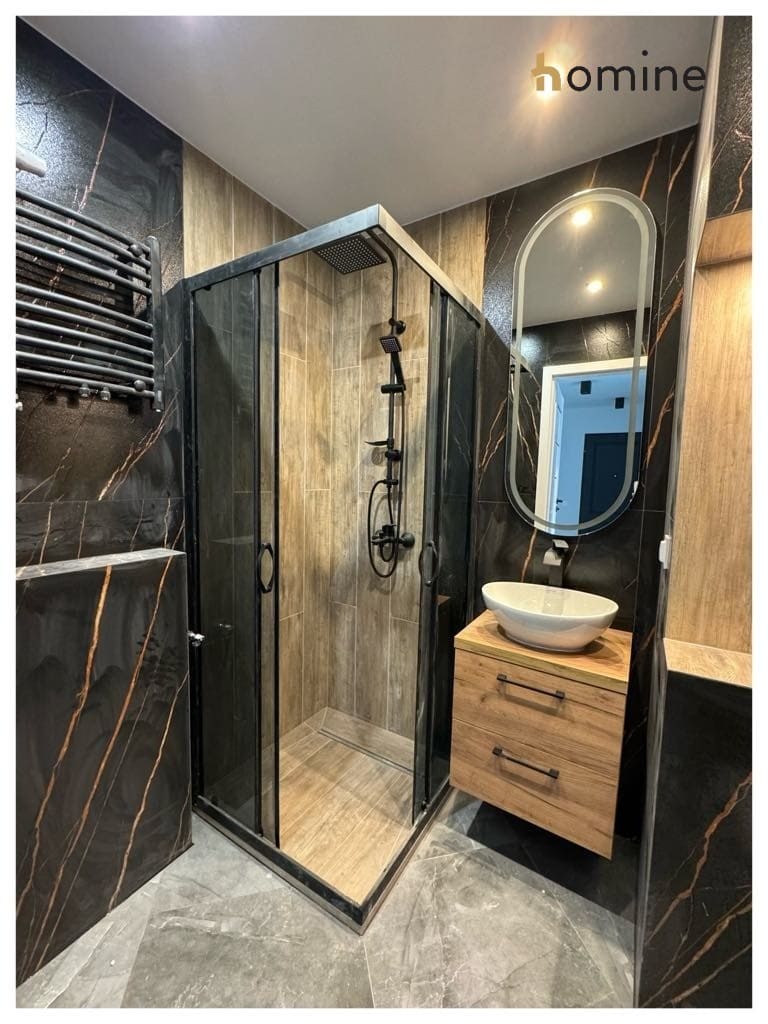 Po generalnym remoncie. W mieszkaniu wszystko jest nowe i nieużywane. Wymienione instalacje wodno-kanalizacyjna i elektryczna. Gładzie na ścianach, płytki podłogowe, panele. Wymienione wszystkie drzwi i ościeżnice, grzejniki, parapety. Nowe podłogi, cała zabudowa łazienkowa. Nowa zabudowa kuchenna. Białe fronty, blaty w kolorze ciemnego grafitu/czerni, kolorystycznie nawiązane do pozostałych pomieszczeń. Dobrane stylowo oświetlenie.